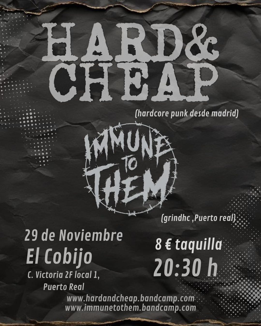 Los madrileños Hard & Cheap y los gaditanos Immune To Them celebrarán un sonado concierto de hardcore en El Cobijo de Puerto Real el sábado 29 de noviembre.
